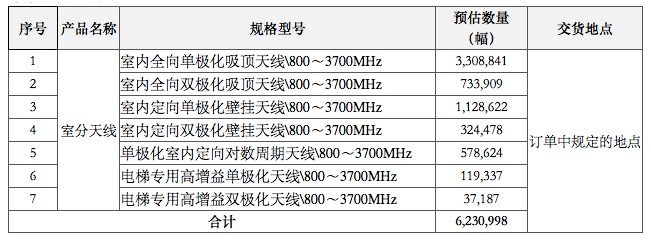 本次集采的产品包括八个规格,分别是室内全向单极化吸顶天线、室内全向双极化吸顶天线、室内定向单极化壁挂天线、室内定向双极化壁挂天线、单极化室内定向对数周期天线、电梯专用高增益单极化天线、电梯专用高增益双极化天线,共计623万幅。