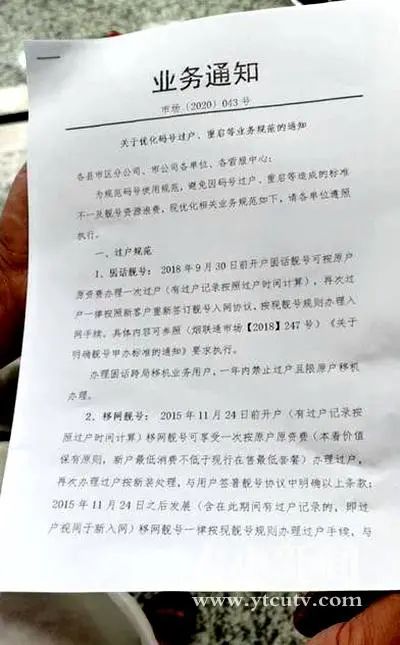 记者在一份烟台联通公司出台的《关于优化码号过户、重启等业务规范的通知》(市场〔2020〕043号)中看到如下内容:移网靓号过户规范:2015年11月24日前开户(有过户记录按照过户时间计算)移网靓号可享受一次按原户原资费(本着价值保有原则,新户最低消费不低于现行在售最低套餐)办理过户,再次办理过户按新装处理,与用户签署靓号协议中明确以上条款;2015年11月24日之后发展(含在此期间有过户记录的,即过户视同于新入网)移网靓号一律按现靓号规则办理过户手续,与用户按照现行靓号标准签署协议。