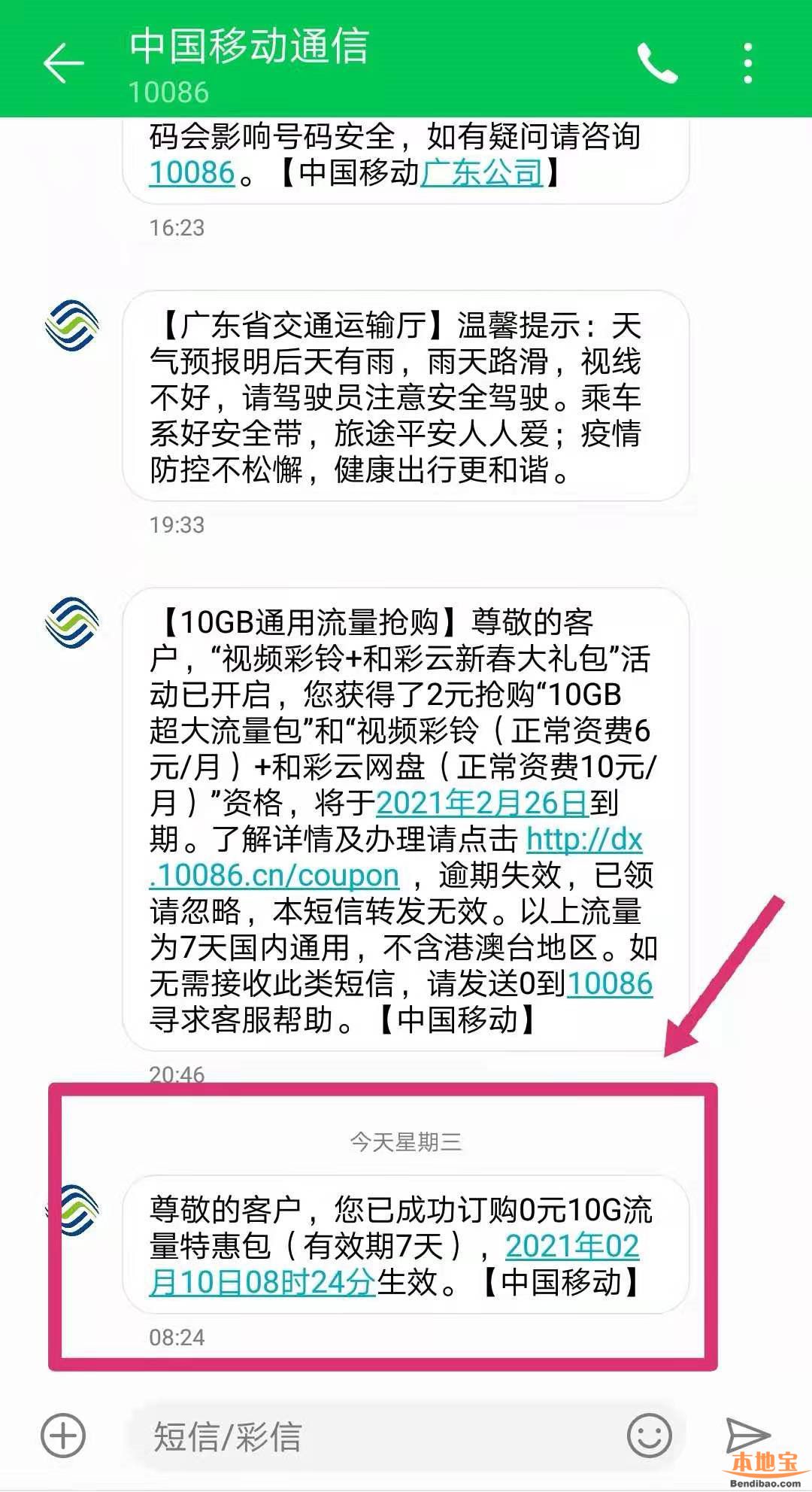 4、领取后,中国移动会发送领取成功短信,请注意查收。